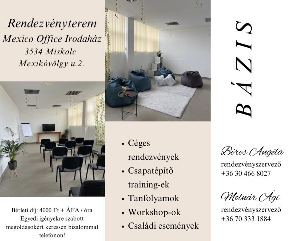 Ha egy modern, kényelmes és jól felszerelt helyszínt keresel kisebb vagy közepes létszámú rendezvényekhez, a Bázis Rendezvény Terem a tökéletes választás! Az 52 nm-es alapterületű terem 20-30 fő befogadására alkalmas, így ideális üzleti találkozók, tréningek, előadások, csapatépítők vagy akár kisebb privát események lebonyolítására.
